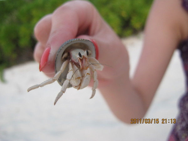 沙滩上有好多寄居蟹的洞,到了傍晚它们机会出来到海边找个好看的贝壳换上~ 基本上在海边看见有颜色的贝壳里面都有一只寄居蟹~~