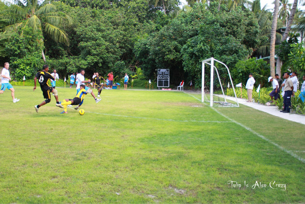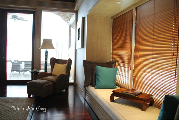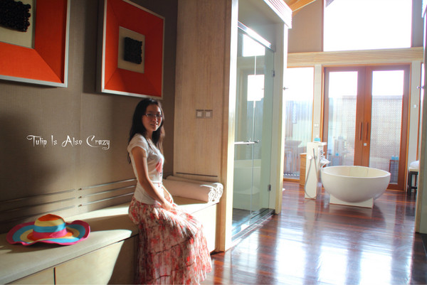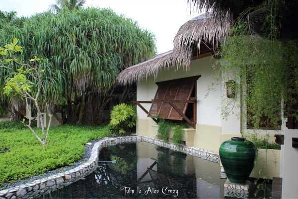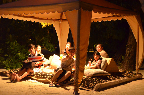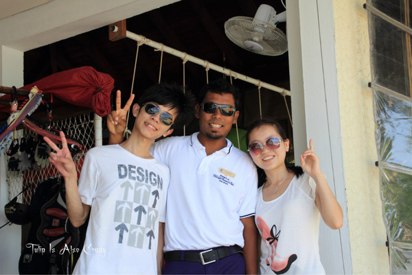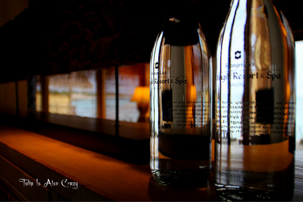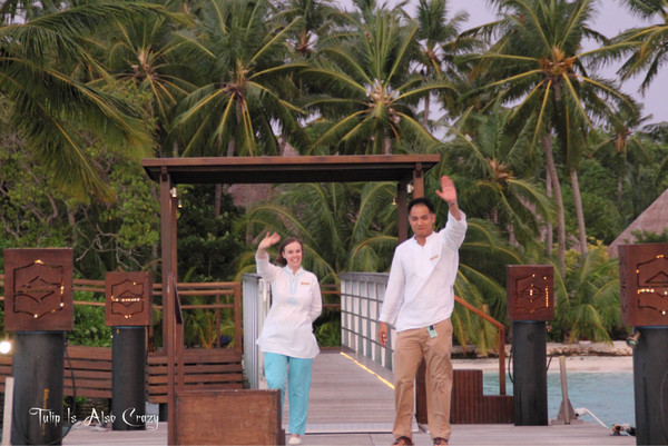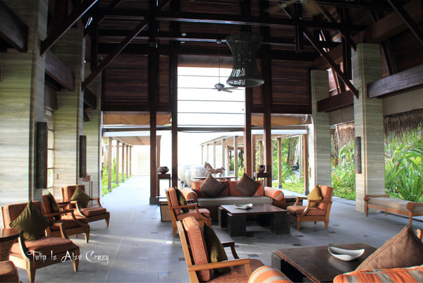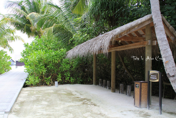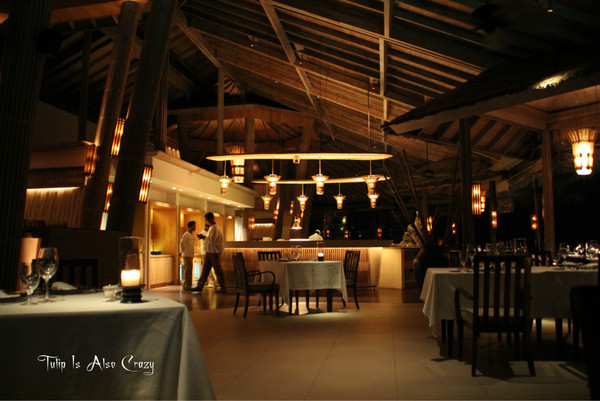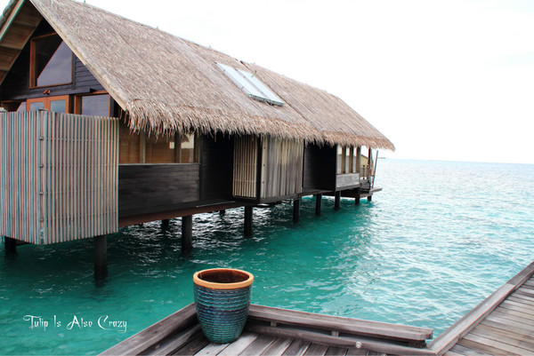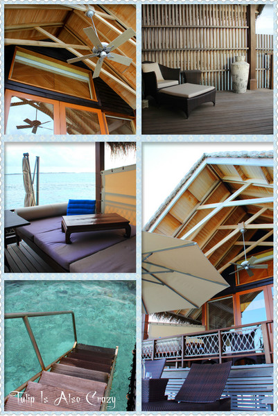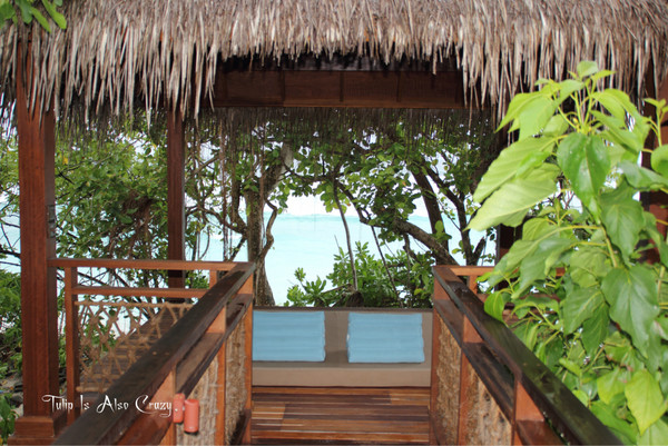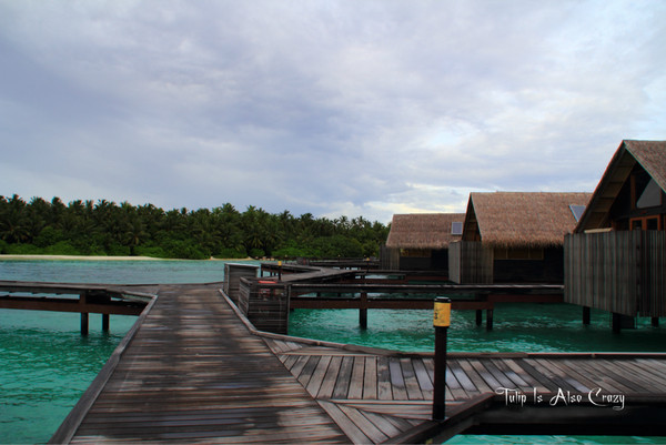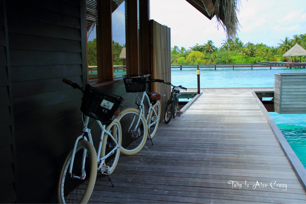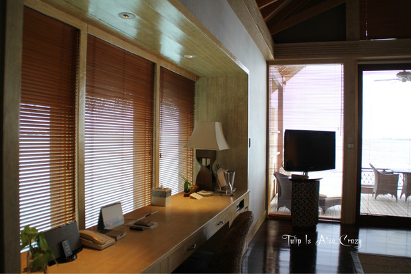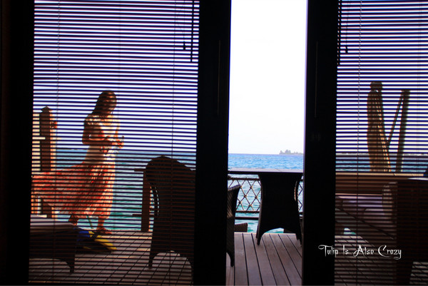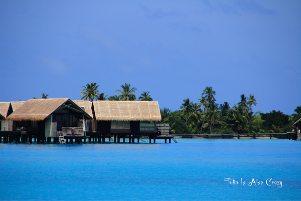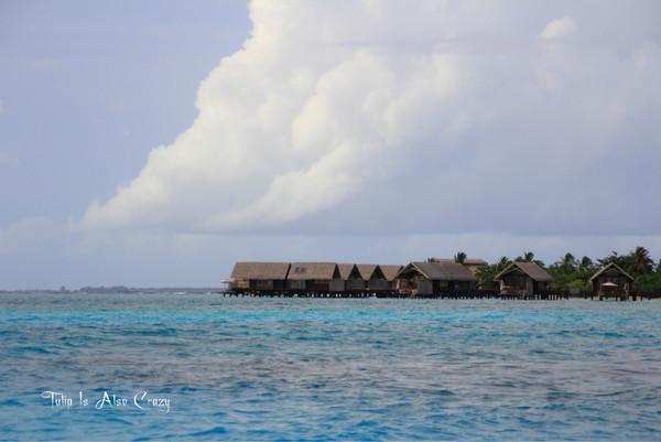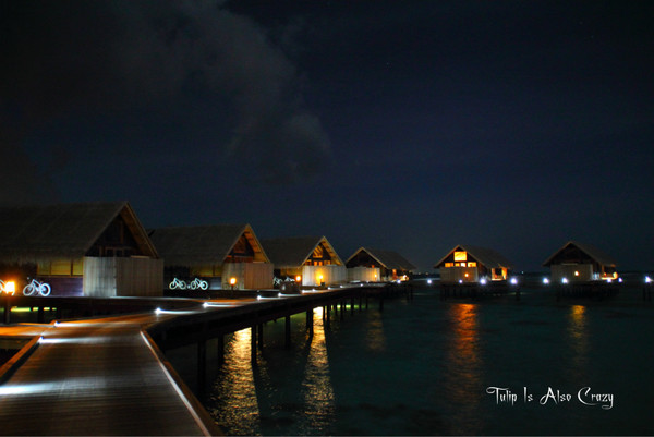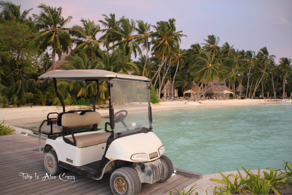 随后,聊了几句,交代了行李,“太忙”就开着buggy带我们去了水屋——1区10号,随后的日子,我们的代号就是:110!so 霸气有木有啊~~~~随行的还有接机的中国MM,主要到了水屋后,为我们介绍房间,及各种设备用途(“太忙”讲英文,对我这种英文水平简直是折磨啊,还好有中国MM)。路上也简单的介绍了各个“草屋”的用途(可是当时心思已飘到椰树上、大海里,所以啥都没记住,害的之后跑出来借浮潜用具,死活找不到地方。被迫等到了第二天才搞定)。 很快就到了水屋,一进房间,凉风袭来,中央空调早已为我们开启。简单的介绍了环境,给了我们地图、房卡、活动表格之后,交了1200的预付款,并订了晚上的晚餐在Fashala吃。然后“太忙”和中国MM就离开了。
