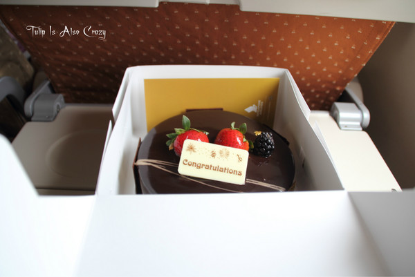 新航赠送的蜜月蛋糕,新航!超值!(可惜的是等我们到了水屋,经过老婆的无数次挤压、保温,已成蛋饼了……)