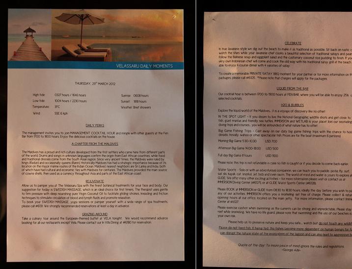 因为没去过其他的岛,所以不知道上岛后冻结VISA卡里800美金押金是不是Velassaru岛上的规矩,还是国际上都有类似的流程。不过这一点还是提醒要选这个岛的朋友留意,上岛后来到前台安排房间前会先要求拿出可以境外消费的卡刷走800美金冻结起来(不是刷走是冻结),如果离岛时结算没有任何消费会解除冻结,如有购物或消费记录可以直接从这800里面减去退回余额,超过800还要另外支付剩余款。在岛上的一切消费不管是深浅、出海钓鱼、SPA、商店购物统统是自报房间号即可,离岛前一并结算。