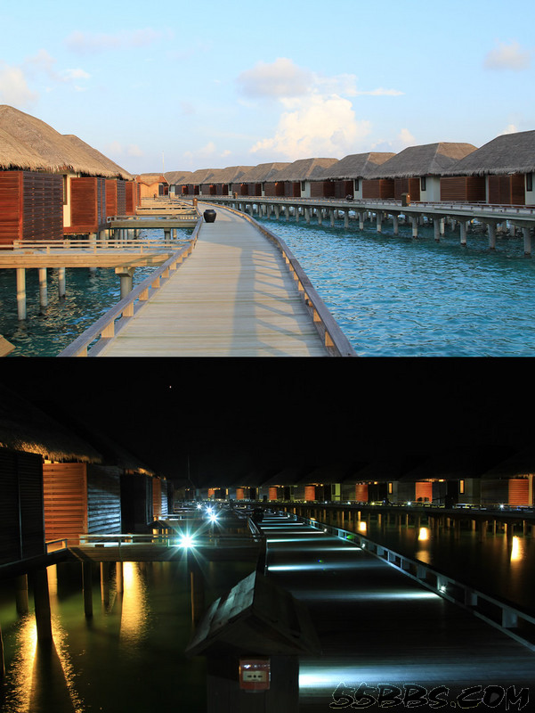 栈道末尾的就是那件豪华的水上套房,会遮挡住日落的房间。他也是观测日落最好的地点