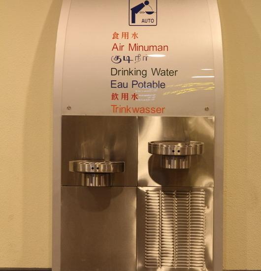好在登记的通道中经常有这样的饮水处,人靠过去感应器有信号时就开始从出水口喷水,凑过去就可以直接喝,不用手,很方便