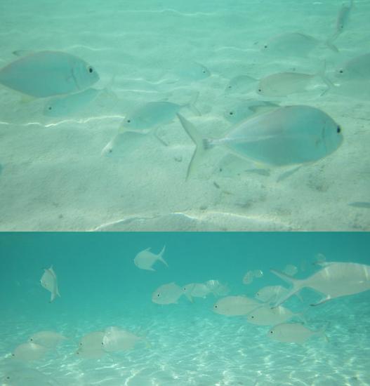 岛的西边是最好的肤浅区域,这里鱼很多水很浅,不会游泳也不用担心,只要有浮潜三宝就可以在海水低于脖子的深度进行浮潜。会游泳的朋友可以在更广阔的水屋区域探索,那边珊瑚虽然很多但是活珊瑚很少。死珊瑚多的地方或者碎贝壳比较多的浅水区都很扎脚,尽可能不要光脚去踩,很容易受伤。
