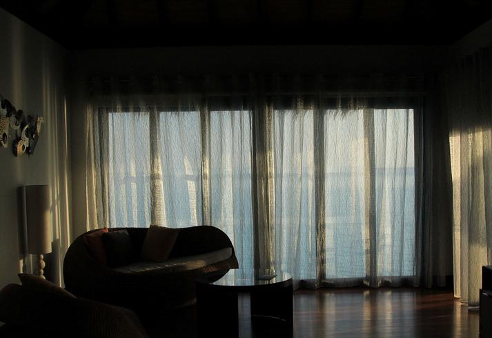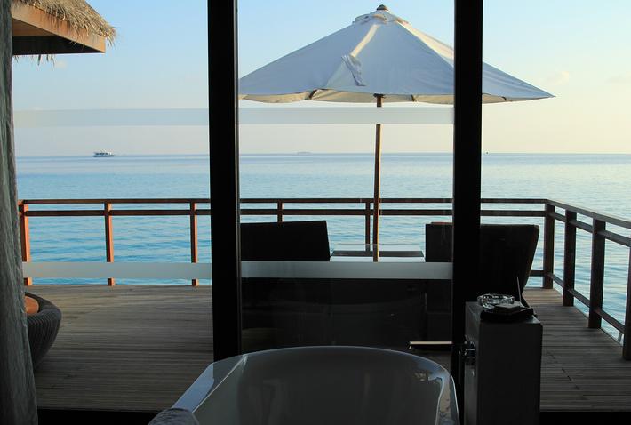 这个是我们住的水屋,床脚面向整面墙的落地窗,窗外就是海天一色的景色,只要没有单人帆船或者浮潜的人,那么视野中将只有海天跟云朵,没有任何其他煞风景的东西(另外一侧的豪水应该会看到岛东边的海滩),着实赏心悦目。海景大浴缸如果你想,可以白天看着碧海蓝天泡一个舒舒服服的泡泡浴。而且因为水屋的位置要比海平面高很多,所以即使窗帘都打开,也不用担心还上会有人看到你的房间甚至是KING SIZE的大床上的风光,加上房间的间距很大简直是顶级的私密性享受。这里提一下,因为水屋都带一个能自己晒太阳的露台,露台上有躺椅、躺椅垫跟大毛巾,所以到晚上会有小黑来提醒你睡觉前把这些东西收到屋里来,不要整晚放在露台上。如果你能听懂英语相信告诉他一句“I see”就可以了,但是我第一次实在是没听明白他的意思,于是让他进来亲自帮我收拾了一下,临走给了他1刀小费。