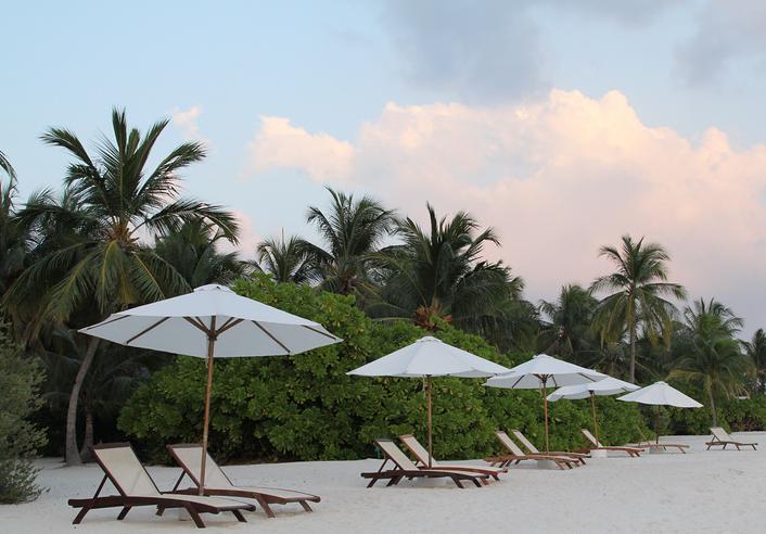 这些沙屋没有露天的浴室,在我看来有一点小小遗憾,因为我跟老婆这些天基本上都是在BV的露天淋浴洗澡的,那种放松的感觉真的跟在家里的小浴室冲凉两个概念。普通沙屋分布在岛的西南跟东南两个侧翼的沙滩上,从地图上可以看出他与海滩之间都相隔了一条小路,所以透过地窗只能看到比较内陆的沙滩,并且路上会有往来餐厅的游客跟小黑们的电瓶车来来回回,私密性不是很好。从这里出来之后需要走一段距离才能真正来到沙滩,而且西南侧的沙屋所面向的沙滩是岛西边的沙滩,很多渔船、快艇停在这里,除了能看到成群的小鱼以外没有任何值得浮潜的景观,也不适合游泳。只是举例租船的地方比较近,喜欢冲浪跟玩儿帆船的朋友可能会喜欢。总体来说我觉得如果是蜜月旅行他的私密性跟情调会打一个折扣,但是除了没有露天浴室跟临近沙滩的后院以外内部装潢应该跟BV都是一样的,价格还便宜很多,也许也有人会欣赏他的价格。