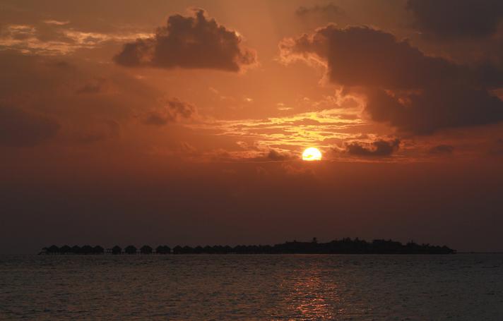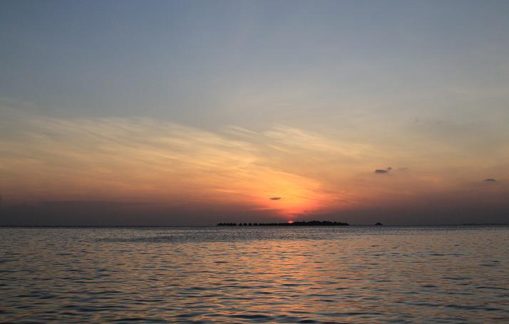 因为Velassaru岛的东侧有一个其他的岛,所以日出是在这座岛头上升起的,而且因为海面上时时刻刻都有云层,所以有时候日出时间过了很久才能真正看到太阳**