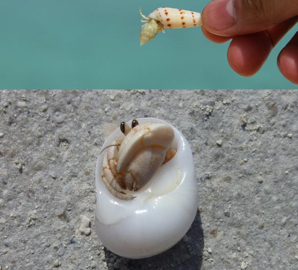 海滩边满是小螃蟹,每一个完整的贝壳里面几乎都可以找到小小的寄居蟹或者寄居虾
