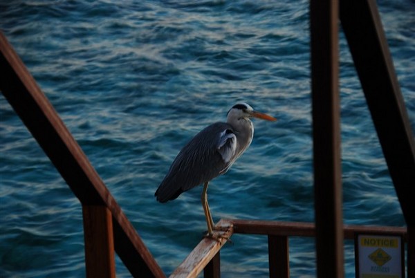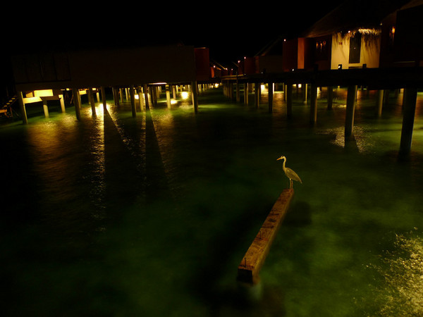 一只鸟停在我们露台的栏杆上歇脚,面朝日落的方向若有所思,之后我一直以大笨鸟相称,这只感性的大笨鸟之后若干次出现在我的镜头,我们来的第一晚黄昏和我们走的那晚黄昏都停在同样的地方,颇有灵性的大笨鸟似乎为我们接驾送行。好吧,他的学名叫白尾鹲,是马尔代夫国鸟,我的大笨鸟。