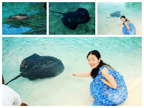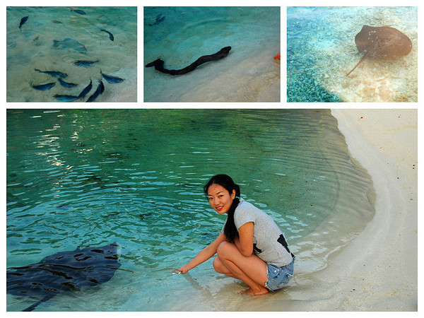 第三天喂鱼我带了福娃糙米卷,更好拿在手里喂,还是那种长鼻子蓝鱼最贪吃,这时一条比第一次见到的小一半的海鳗悠悠的游过来,正吃着的蓝鱼四下散去,海鳗竟然慢悠悠的要挤上沙滩,姿态非常温和卖萌,此时离我的脚很近了,我退后两步后把手悬空放着让大狗拍照,这是远处一个工作人员大声的警示我们,后来他过来后说:这种不是鱼,是蛇!非常危险!有毒!