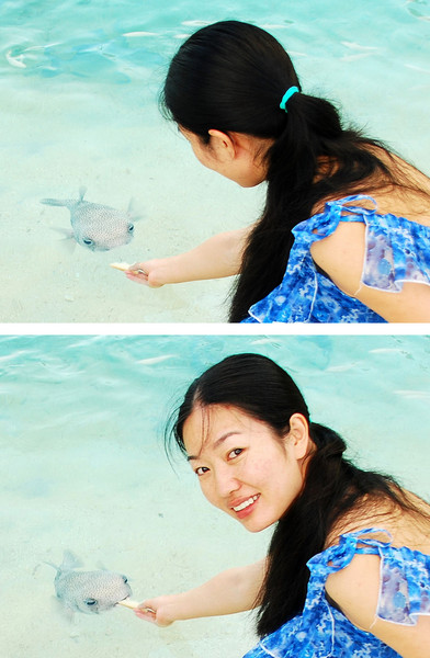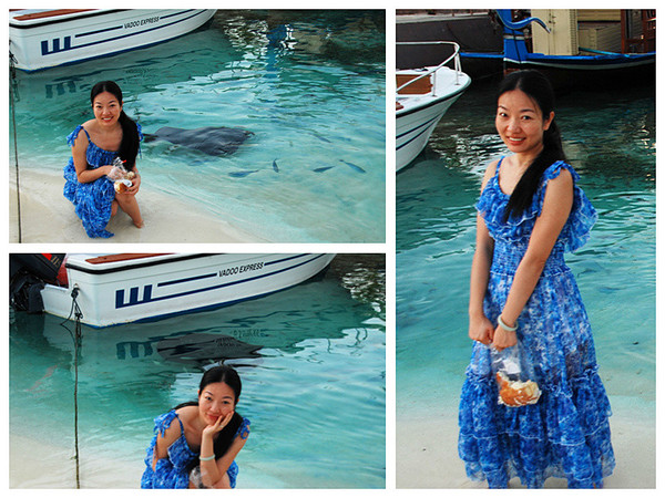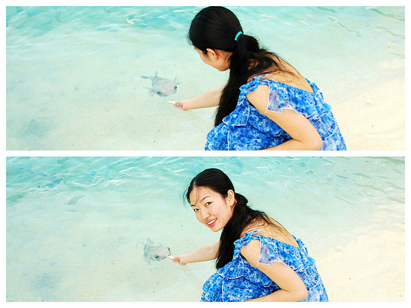 拍完日出看到魔鬼鱼果然悠然在码头一圈圈晨练,还有其他一堆小鱼,我的面包派上用场了,这些鱼跟狗儿差不多贪吃,一堆蜂拥而上,特别是蓝色有个长鼻子的鱼,为了抢食几乎都跃上沙滩挤到我的脚边了,这是我的船长船员也从码头停靠的船上醒了,其中一个船员教我像喂狗狗一样喂鱼,把面包拿在手里,鱼儿就游到手边叼食,鱼群中有一只憨态可掬的河豚,行动缓慢老无法抢到抛出的面包,我抛出一个面包,一堆鱼都散开抢食,这时我手里拿着面包停在水里,小河豚慢慢吞吞摇头摆尾不知死活的独自游到手边,吃了面包又慢慢游开了,那样子简直萌死人了,我跟大狗给她取名大眼妹。于是大笨鸟成了大狗的代号,大眼妹成了我的代号。
