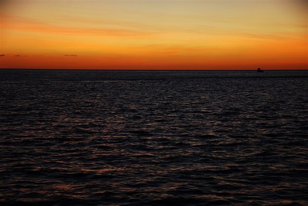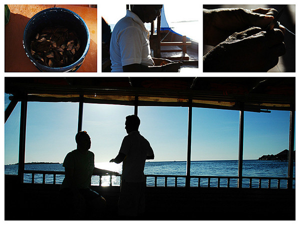 今天要出海打渔,17:30坐着船到了深海,船上的船长在夕阳下的剪影引起了我镜头的兴趣,其他两个水手也都友好略微羞涩。抛锚后,每人发了一盘像放风筝盘的钓鱼线,一桶鱼肉的鱼饵,各自找个点蹲下开始钓鱼