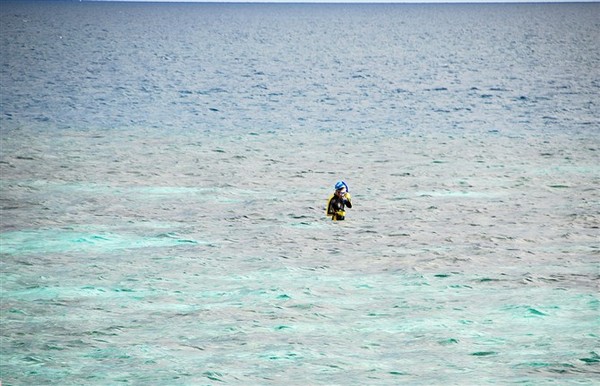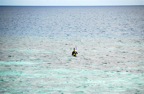浮潜区一般都是珊瑚浅海区,到了珊瑚区的边缘就是深海,工作人员警示的是不要去深海区。我溜达到深海沟那转过两圈,在海沟边有种在悬崖边的感觉,那种深蓝秘境的诱惑似乎有种神秘吸引力,一下让我想起吕克贝松的电影《碧海蓝天》里描写的深海对男主角致命的吸引力。我也想去看看,但想到家乡的亲朋好友,最重要想到了鲨鱼,拍了几张海沟后就折返了。第二次去到海沟时我还听到了一种明显的啸叫,像一种声纳,不知是不是鱼类的语言