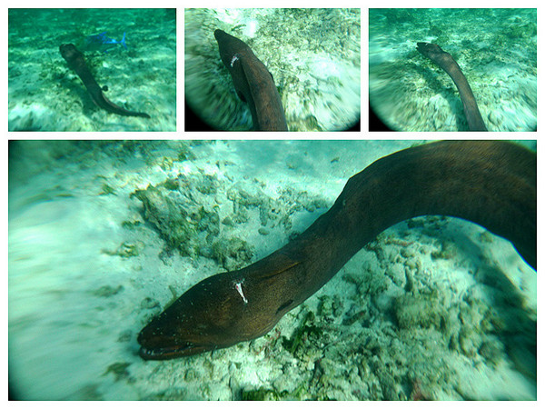 关于浮潜还有一个插曲,第二次下水一会就碰到了一条蓝色的大鱼和一条1米3以上的大海鳗离我很近的游着,第一次浮潜见到这么大的海洋生物,而且他们不怕人,让我很兴奋,举着相机一路跟拍,海鳗也不紧不慢,显得温和淡定,我当时对于鳗鱼的概念都停留在鳗鱼饭的基础上。我拍了几张清晰的海鳗近照后得寸进尺想掉个头拍个正脸特写,结果海鳗突然停了下来,我感觉他的表情在变化,他正冲我龇牙!近距离的威胁突然让我感觉到了他的危险性,愣神一秒后我扭头就跑,回头看他也反方向游走了。