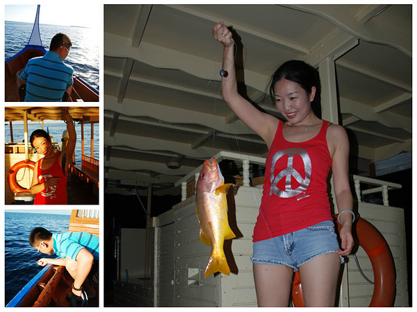 船长开始一直帮我钓,我边看边问:怎样才知道鱼上钩了?船长比划鱼线上下拽动,我试了一下感觉有动静就赶紧起钩,船长总是摇头,结果真的都没钓上,我问:你怎么知道没钓到?我再通过观察发现船长起钩时如果线是很紧的才代表有鱼。在船长帮我示范钓起两条鱼后,我自己就开始有收获了,第四条我吊起来一条估摸五斤多的大鱼,大狗帮我留影,我得意的说:“please call me fish killer!”