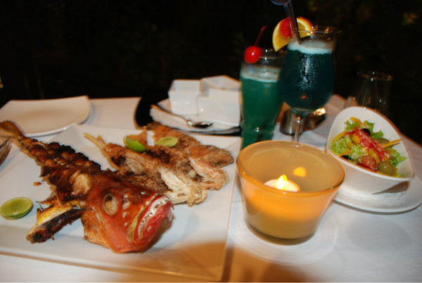 晚上花20美元加工的鱼上桌了,都是煎炸做法,味道相当不错,点上两杯“blue heaven”和“long love talk”在沙滩边走廊上大快朵颐,另提一句:某人一条鱼都没钓到,但吃了不少