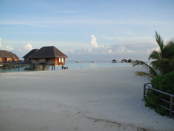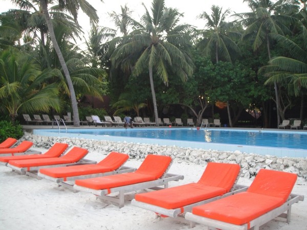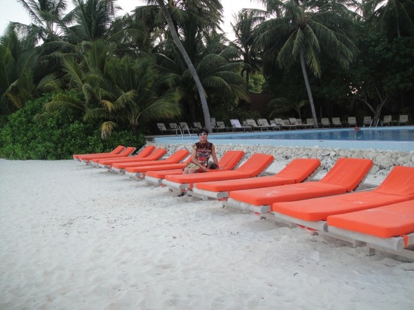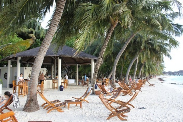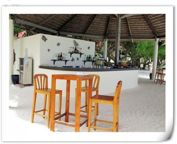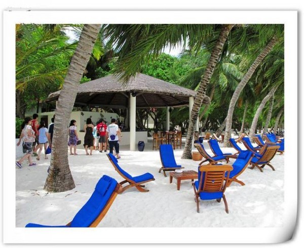 这里就是海滩酒吧。暂时的宁静!稍后的快乐游戏。这里可以免费享受 加冰椰奶和各种冰饮,香槟酒,等等。地球人都知道,农夫山泉有点甜,马尔代夫的水有点咸。哈哈!来这里度假无需担心水缺乏,这里免费滴!喝了香槟酒就乖乖的坐在沙滩的躺椅上享受阳光的沐浴,如果下海我担心你真的会免费喝海水啦。搞不好喝进肚子里一条鱼也说不定。哈哈!我猜想喝进肚子里的鱼带回中国海关不会罚款滴!潜规则哈哈!