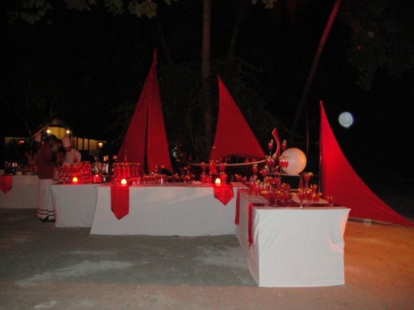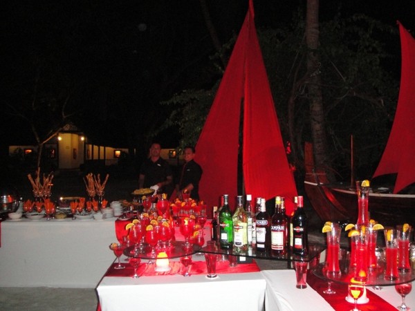 这就是上回书讲到,卡尼岛如同枝繁叶茂的树。枝干顶端这张和上一张全貌图照片做参照,请大家找找看,能否找到我所居住的水屋?镜头拉近一点看看,中间圆心就是水屋前台,里面有迷你酒吧。哈哈!大家可以看图片上方有一条白线,那里是堤坝,可以把汹涌的海浪隔开,这样在水上屋浮潜时就会感觉海水是平和滴。哈哈!咱的快点走啦,红色主题晚宴快开始啦!
