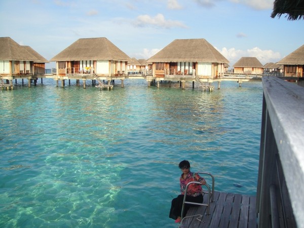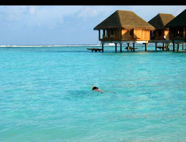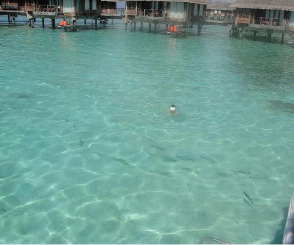 下面有人浮潜,哈哈!有一群鱼陪同他,鱼的个头不小吧?我曾经浅谈一点沙滩屋门前水深只在腰部以下,鱼很小,海底的珊瑚看不到漂亮的,只有残缺断体的珊瑚。而水屋水深到我的颈部,鱼的个头也大,珊瑚很漂亮。不难看出房型与价格的关系啦!哈哈!