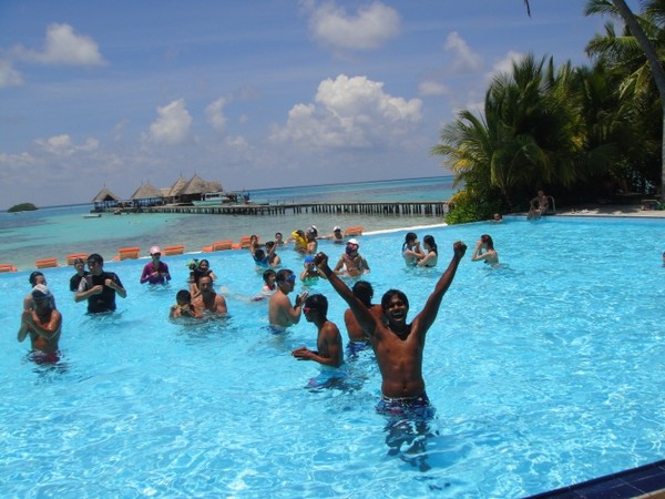 有氧运动水上操开始啦!振臂高呼的就是上文曾经提到的那个中文名字叫马马虎虎的GG!他表演哑剧很搞笑。哈哈!他同我打招呼时,我让他叫我阿姨!哈哈!他不叫。我就说那就叫我姐姐吧!哈哈!他就大声喊 姐姐好!哈哈!好可爱的GO小哥哥!