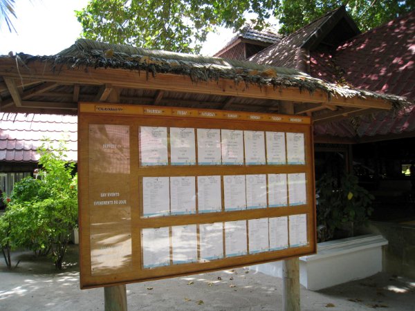 主餐厅旁边的节目安排栏,上面用中文、日文、英文、韩文和当地文字的一个每日节目安排时间表,供大家选择适合自己的时间一同参与游戏活动。
