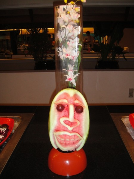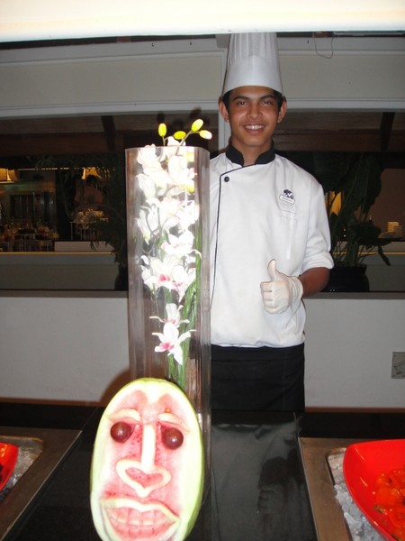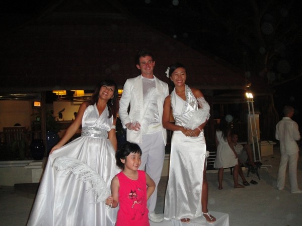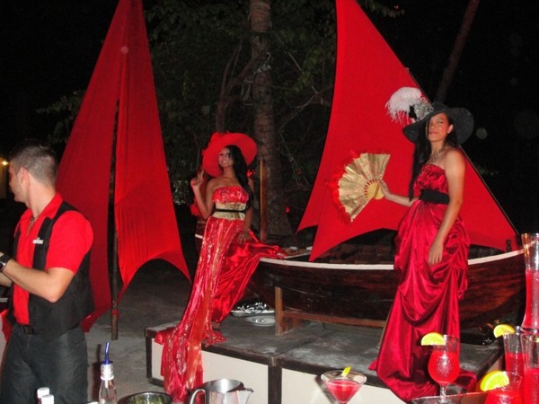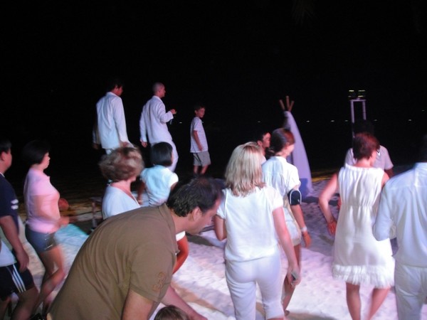 下午当地时间14::00点,北京时间17:00点。蓝天、白云、椰树、美女、帅哥,所有的烦恼被跑到九霄云外去啦!一直玩到快吃晚餐才依依不舍的回房间换洗整齐去享受第一次异国晚宴。这里每天有不同的晚宴节目,前面有介绍不同颜色的衣服就是为了配合每天不同颜色主题晚宴。今天的晚宴主题是民族特色,哈哈!