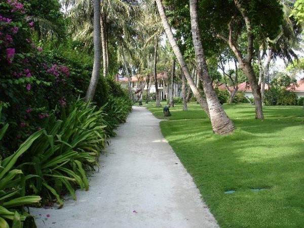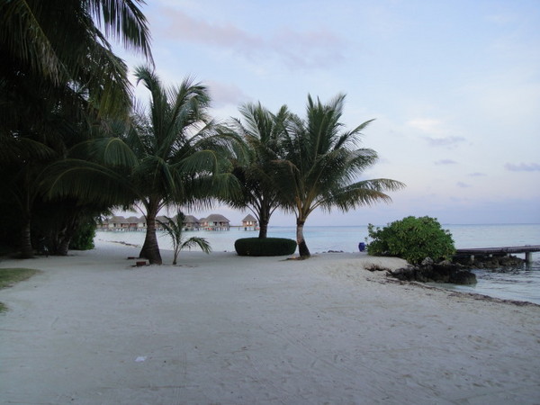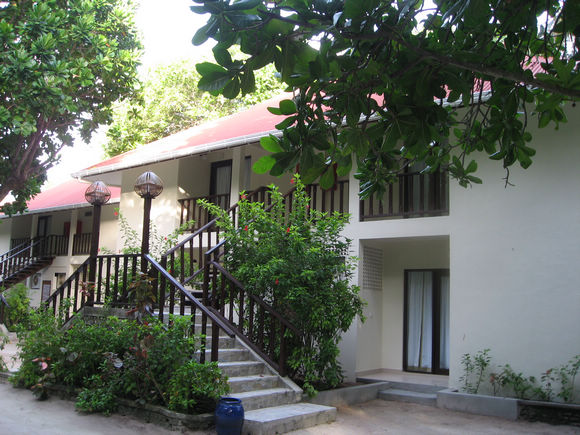 沿着餐厅的白沙小路向南走就到了我的高级房,大家是否看到前方隐约可见两层的小楼房?再向前延伸就是水上屋。哈哈!我真的中奖啦!哈哈稍后解说。