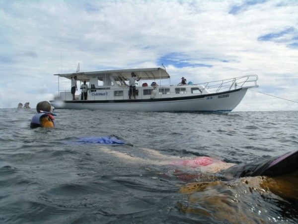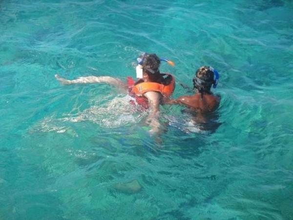 我的水性如同我的英文一样糟糕,或许岁月不饶人吧!人该服老时就服老!哎~~ 不一会就喊救命啦!哈哈!不用担心,我只是心里叫救命的啦!陪同的GO帅哥就会快速游过来,让你脸朝上背朝下把你拖到船边。