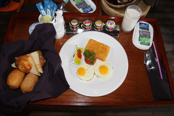 免费享受国王般的待遇。8点左右送餐的工作人员把我昨晚点的早餐送来啦,我礼貌滴用英语问候他,早上好!再用中文说:谢谢!他们喜欢听你用中文说谢谢!我并且附上小费表示对他的服用评价。哈哈!他也会用生硬的中文说:谢谢!我叫的早餐是。饮料:鲜奶、玉米片、热巧克力、脆可可。主餐:炒面、先果盘。主菜:欧式炒蛋、荷包蛋、鸡肉香肠、土司面包。哈哈!我要多吃点,这顿餐要坚持到下午13:30时分滴。