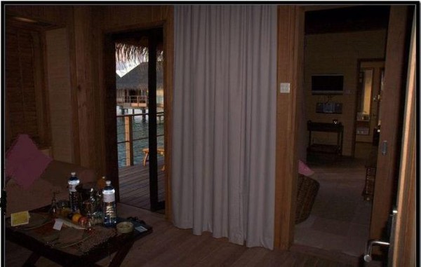 这里的工作人员会带你进入水屋,热情的用英语讲解水屋所有设备的使用和注意事项,讲解的十分详细。哈哈!他讲解的再详细本人只能听懂里的熟悉的几个英文单词,还好,工作人员的肢体语言表达的要比语言表达更清楚些。哈哈!这里是客厅,有一大一小两个沙发,可以看到有两个门可以进出的。一个小门可以不用通过卧房就可进入水屋阳台。另一个就是进入卧室的门,延伸看可见电视、洗漱间。