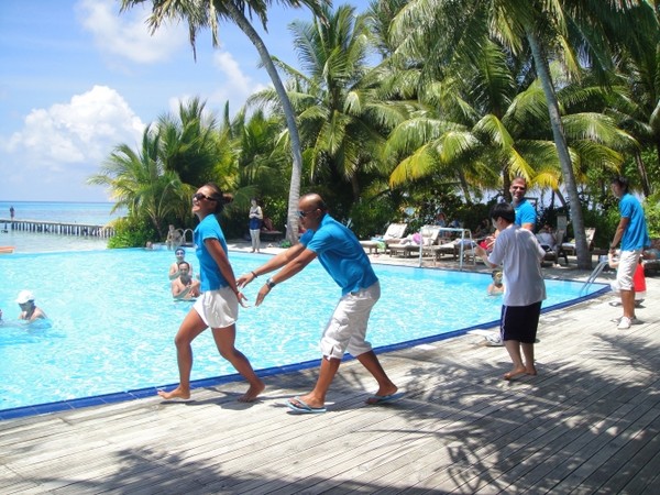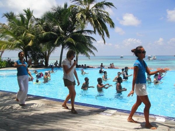 11点45,的时候,这里会来很多参与水中有氧健身度假者,GO带领大家做有氧运动游戏。哈哈!还设有开放式健身房,提供伸展操、肌肉训练、有氧舞蹈、阶梯有氧等各种课程;此外还有羽毛球、篮球(有篮球场)、沙滩排球、桌球、撞球、足球(有足球场)、放大版西洋棋,以及法式铁球(Petanque)。