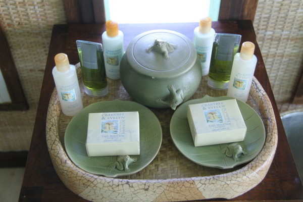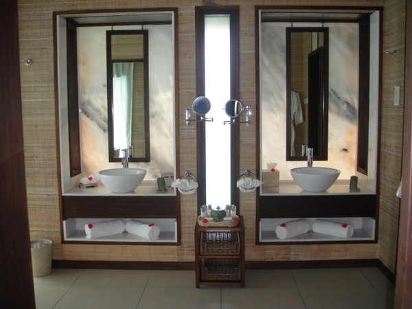 洗漱间很狭小,左手边是厕所,右手边是淋浴间,环境还是不错滴。哈哈!说了一堆话,换房时间快到了,马上到14点啦!赶紧把大件行李放在门外,一会儿小黑会把你的行李送到水上屋所住的房间里面。哈哈!不要忘记把小费放在床头,表示你对他们服务的好评。