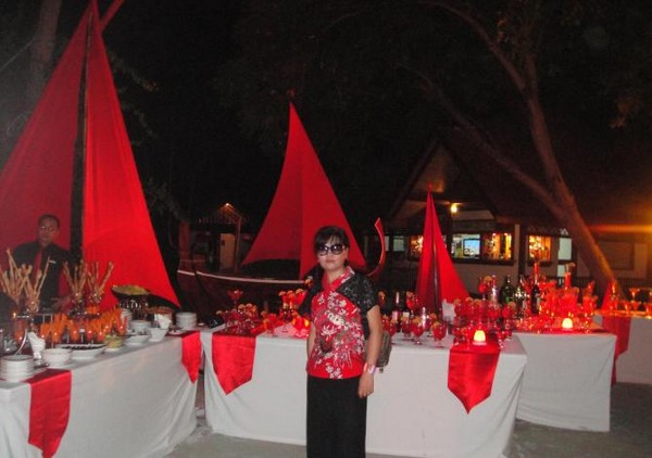 这里的甜点超有诱惑力,本人爱吃甜食,平时养生节制有度,度假期间就破例啦!这次餐厅里的美酒饮品我基本上没喝,因为外面前台旁边的大榕树下就是今晚的红色主题,等稍后大家看了就揭晓啦!