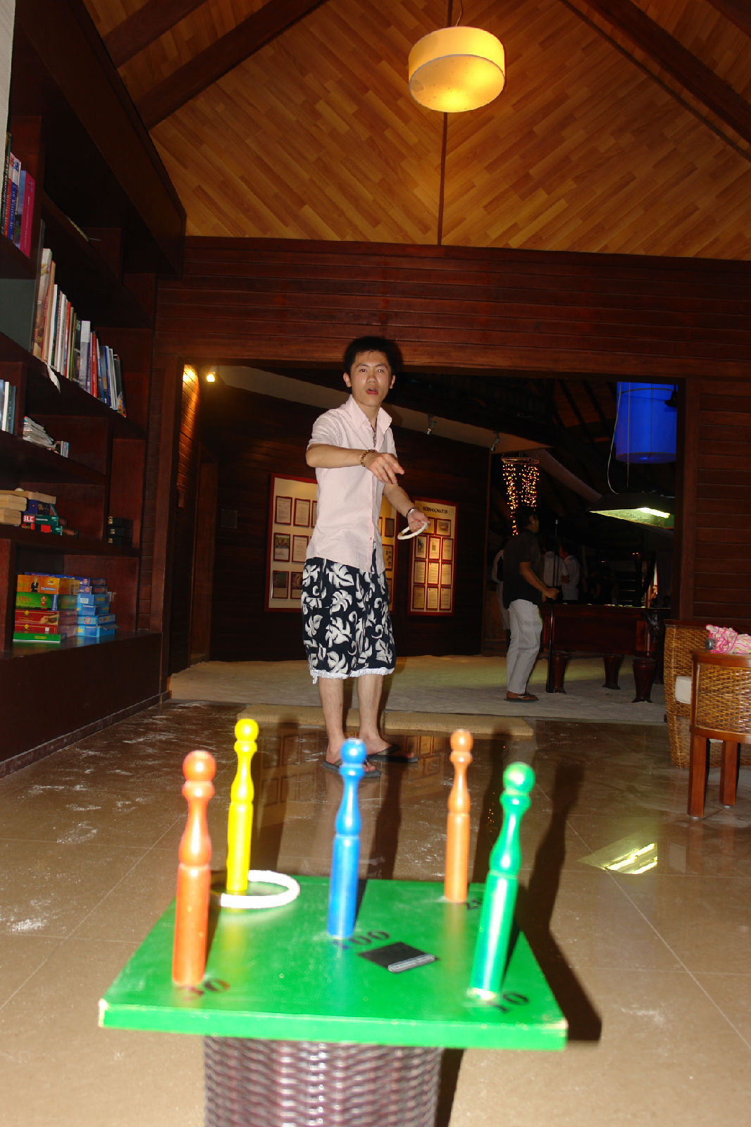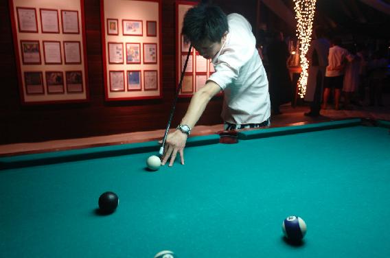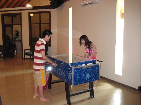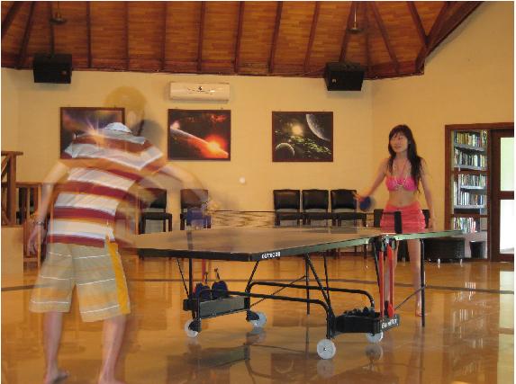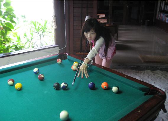 起床后,居然下起雨来了,有一点点不爽。去吃早餐的时候小黑们在每张桌子上都放了一张宣传单:Raining? so what? 是啊,下雨,那又如何,一点也不影响我们玩乐的心情!~仔细看了一下上面的推荐项目,只有一个乒乓球比较想玩,但离可以玩还有一段时间,于是吃完早餐,我和饼干两个台球狂又去霸占台球桌。。。。