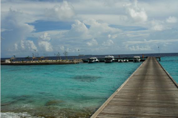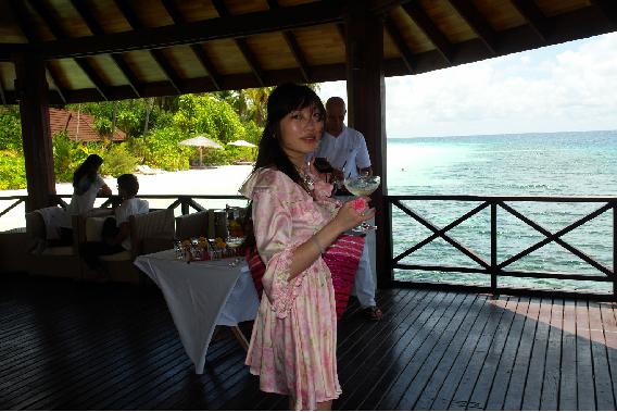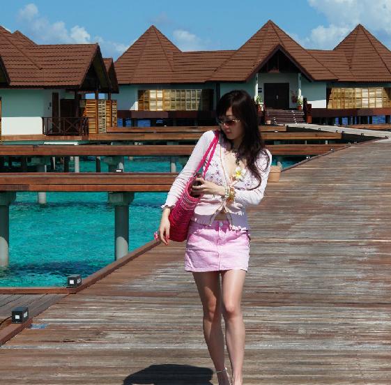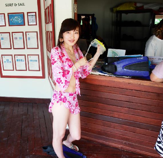 20分钟后,眼前出现在两个岛,远远的看着,大家都在猜会是哪一个。。。不管猜对与否,我们还是到了,码头上早早已经有人在迎接了,出乎意料的是居然有个中国的GRO(这里插一句,在其它童鞋的游记里,他们管这叫G.O 我不知道为什么。好几年前的我,也担任过与这MM一样的职位,名叫:GRO 是Guest Relations Officer的简称,所以请原谅我坚持要说是GRO),她叫Selina。。。
