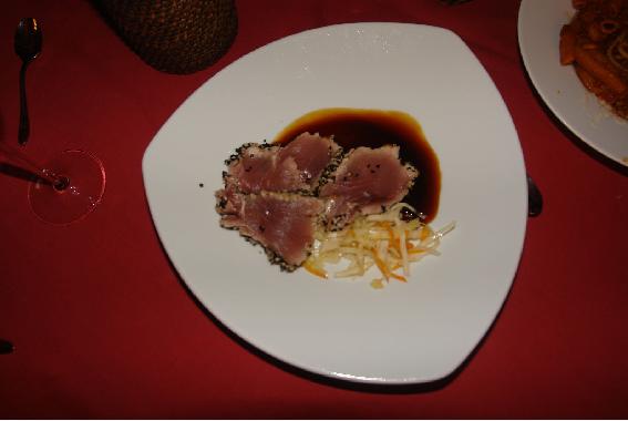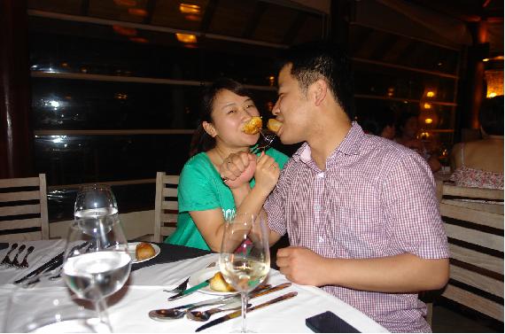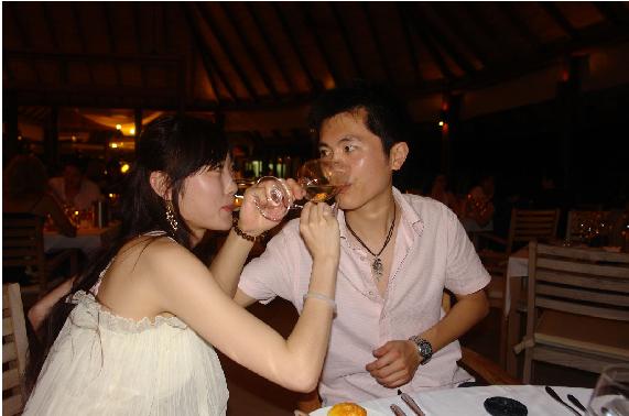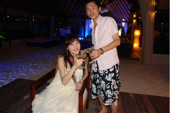 当晚因为是主题晚宴,所以没有开自助餐,而是吃套餐。我们三对今天上岛的中国夫妇还是座在了一桌