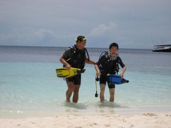 氧气瓶是相当重的,压得我们三个都没直起腰,RUDY怕我受不了,一直鼓励我走快几步到海里就不重了,其实我哪里有看上去那么脆弱,人家上大学的时候是校体育部的部长呢