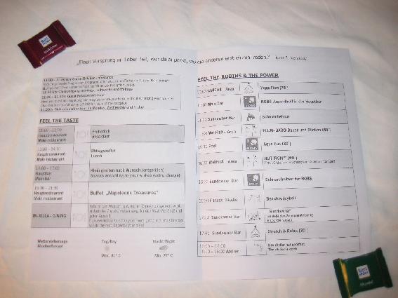 下面有一张第二天整个酒店可以吃可以玩的备忘录,会提醒哪些是随便玩,哪些项目是要另外收费的用两种文字写了(不包括中文)