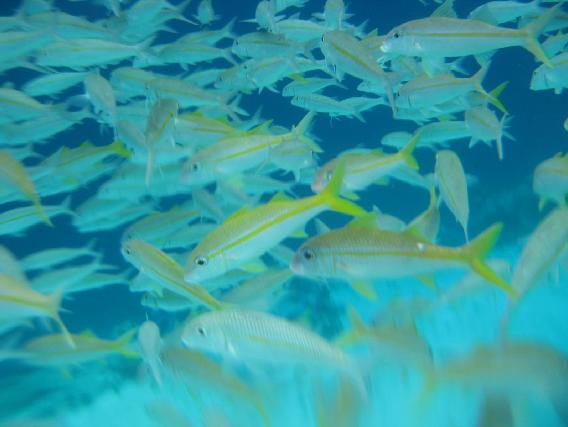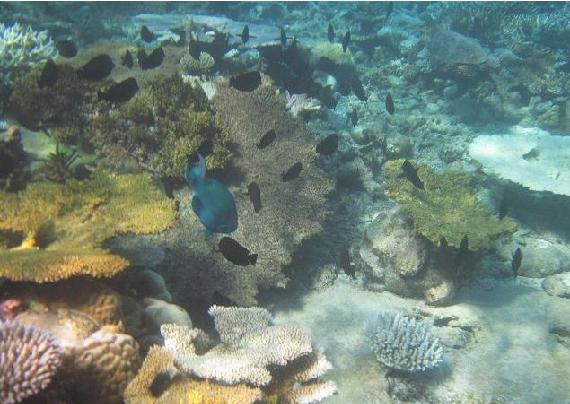各种有半人长的大鱼在珊瑚上悠闲的逛吃,吃着,时不时追逐其它小鱼玩玩,各种颜色和形状的珊瑚看得眼花缭乱
