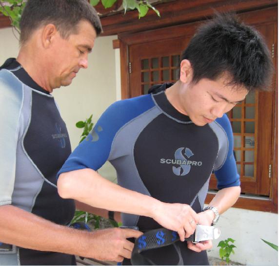 先穿上潜水服,然后在腰上绑铅块。我被绑了好多块。。。又刚好卡在腰和肋骨处,有点硌着疼。饼干也绑了不少,我俩有点瘦,教练说怕沉不下去,所以得多加点重。。。