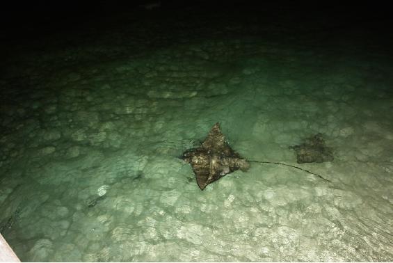 我们把房间地板那块透明玻璃下的灯打开,不一会就汇聚了好多鱼在灯下边玩,从房间的玻璃下直接看得很清楚!~因为涨潮的原因,鱼是特别特别的多,各种颜色和尺寸