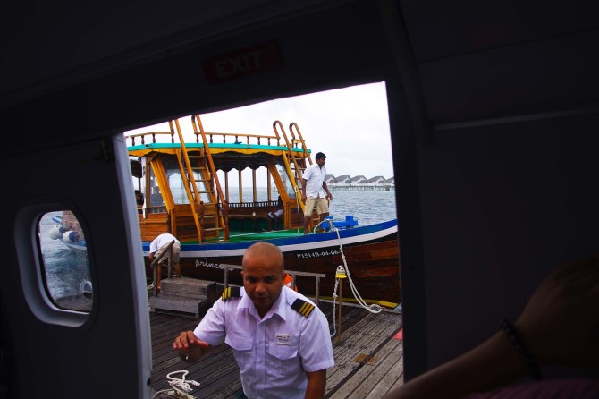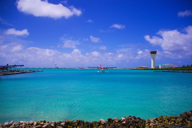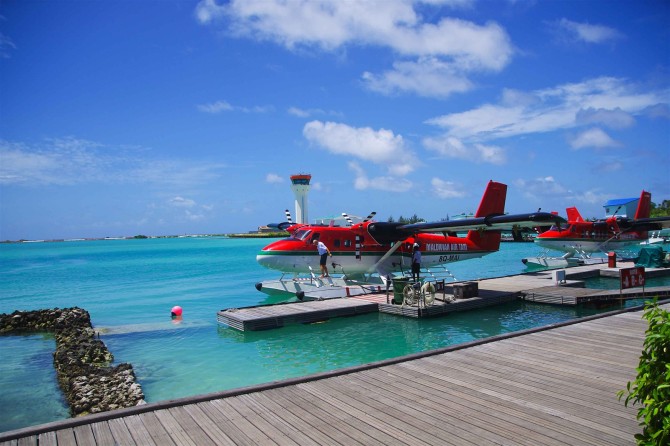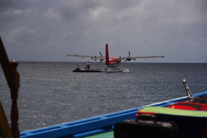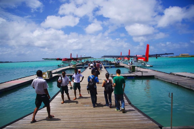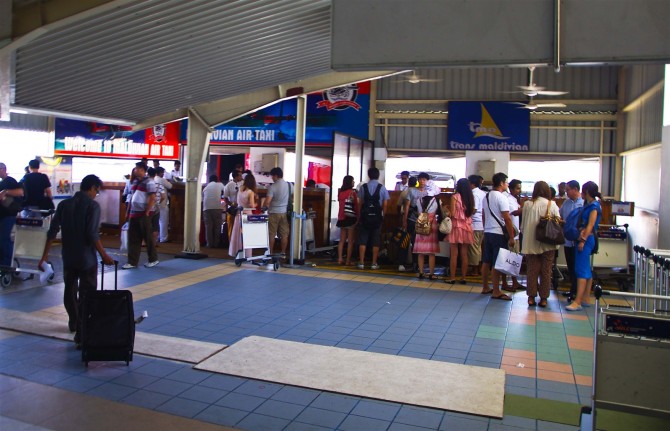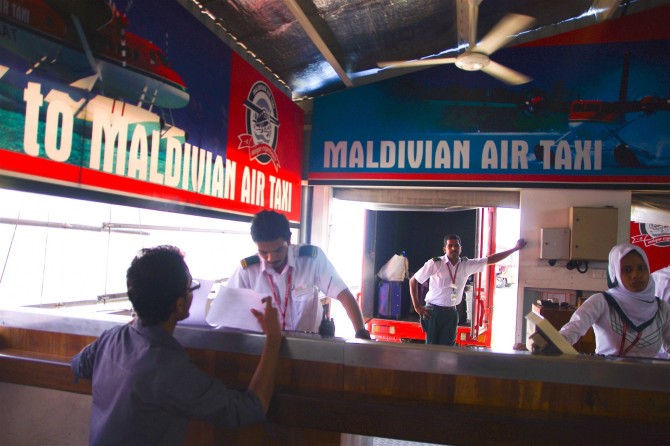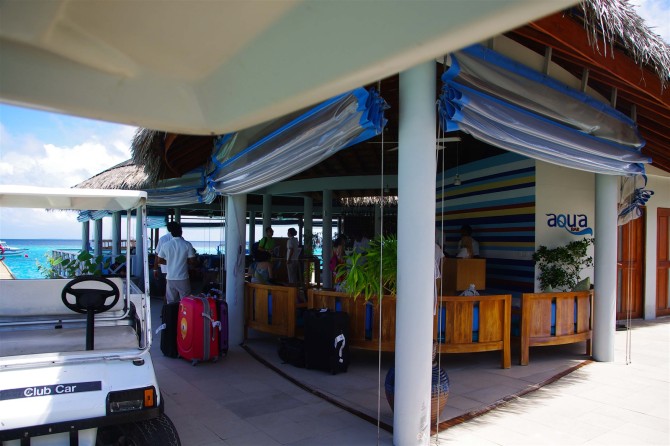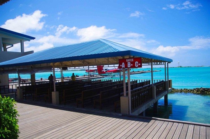 马代机场里的水飞柜台,一共两个水飞公司,不同的岛是不同的公司,水飞票从这里取,行李也是在这里托运,不过一切都不用自己操心,都由酒店的接机小黑帮忙办理~注意,每件行李都要称重,包括你背身上的背包都要给他们称重贴标签由于同机的行李超重,我们的有一个箱子要搭下一班的水飞上岛害的我上岛以后只能穿着运动鞋坐着房间外发呆,没拖鞋,没泳裤后来等不住,赤着脚跑到总台去催行李~再后来几天在岛上就经常赤脚了~~~