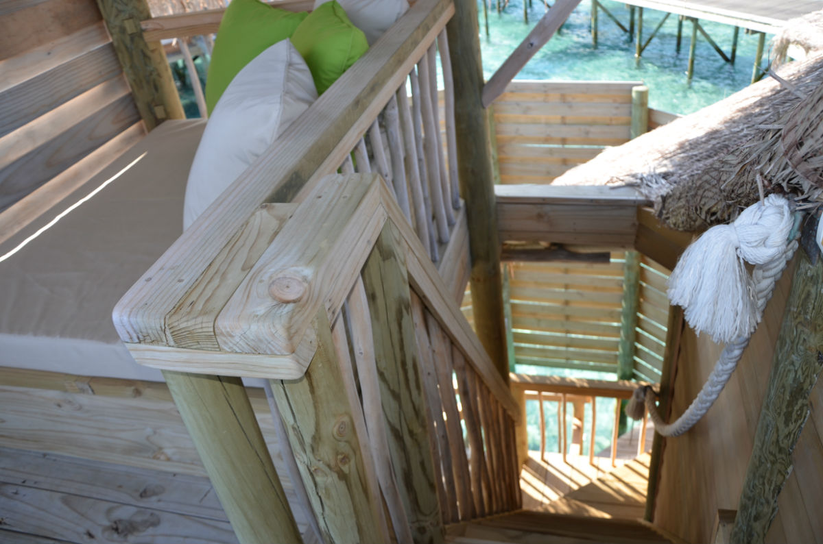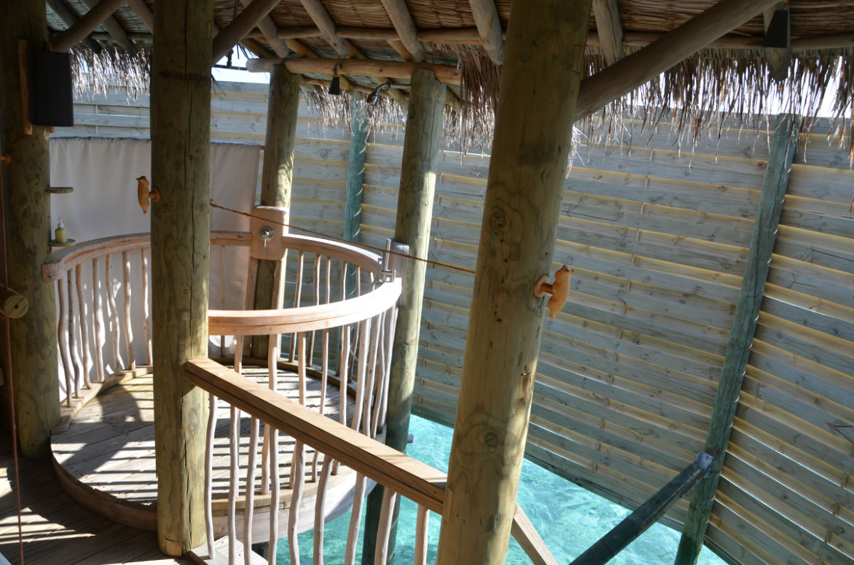 这是水屋外部了,左边小桌下是透明的,上午可以看到鱼群,右边有梯子可以直接下海,旁边有冲水龙头,上来后可立即冲洗