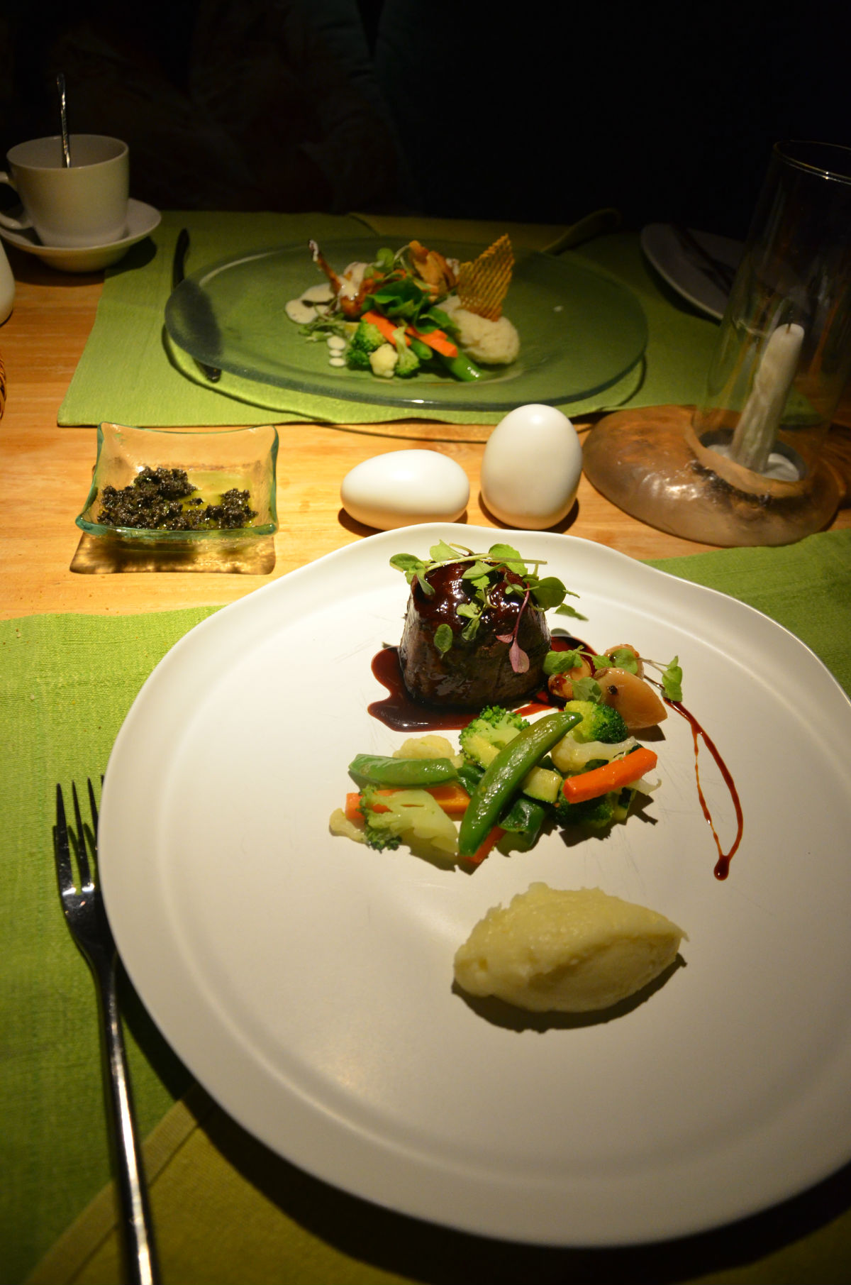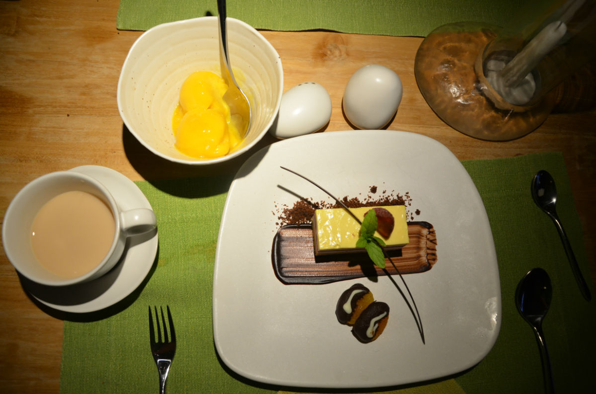 我们四天,第一天点晚餐没经验,是由服务生Ford帮我们点的,头盘给我领导点的是生鱼粒,给我的是日本寿司沙拉,主菜都是当地的一种鱼,对那个石榴籽的味道记忆特别深刻,甜点是巧克力慕斯蛋糕;第二天是自助晚餐,第三天我们自己点了,名字拼不完整,就随便和大家描述下。头盘领导是冰镇椰汁浸很小的一块鱼块,我点了西瓜乳酪,领导想吃鸡肉了,主菜点的是鸡胸,我吃的是澳洲小牛肉,甜点是芒果冰淇淋和起司蛋糕;第四天点了当天的主题菜,斯里兰卡美食,上来一蒸笼,心里一惊这么大。掀开一看还好还好,都是小盘装的,两份米饭,为了不浪费,硬是把这两份米饭给吃下去了。好饱啊。那天又下雨,刚好慢慢吃,结果雨越下越大,最后由酒店电瓶车送了回去。