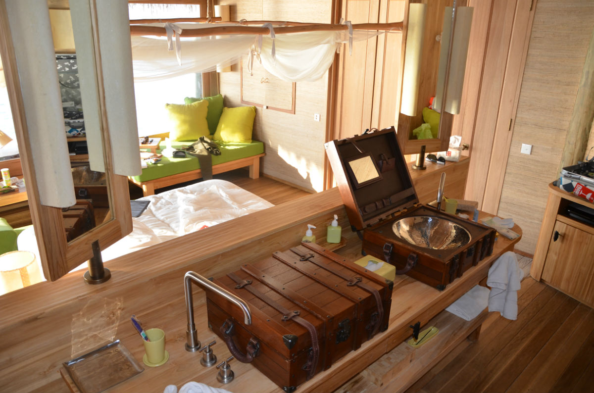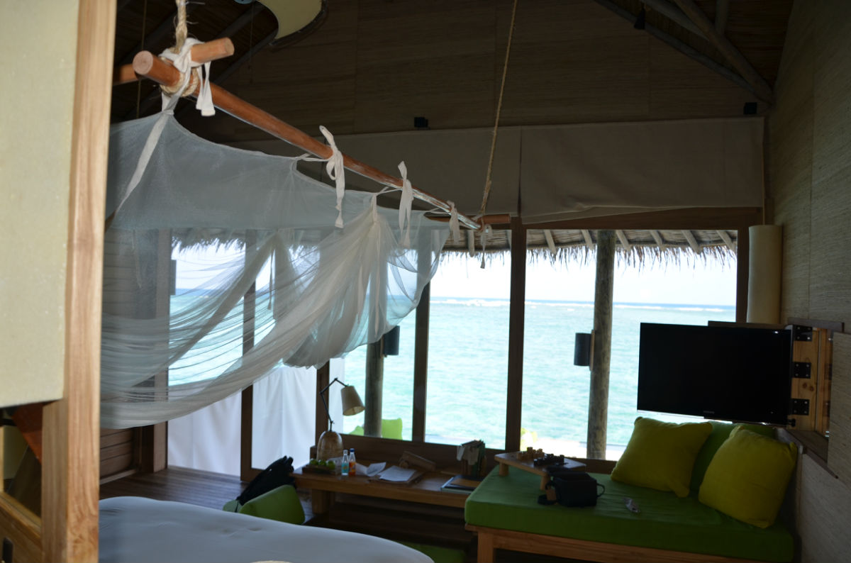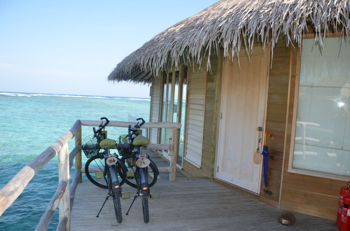 快艇还未靠上码头,酒店经理和一行服务人员已经在等候了,上岛后送上两小杯当地的饮料后,经理做了简单的问候,然后有一名服务生成为了“my man”,也就是我们四天在岛上的专职服务员,有任何问题都可以联系他,他会安排我们的一切。他先是给我们做了公共区域的介绍,总台、巧克力屋、冰淇淋屋、酒吧、藏酒窖,然后坐上电瓶车朝我们的居住区驶去,一路上再介绍SPA所在地、瑜伽馆、有机蔬菜园、有机餐厅、露天电影院、水上运动出发点,因为我们住的水屋是靠最里面的一边,一路上就是在热带丛林里穿梭,迷路了伤不起啊。终于到了水屋门口,终于见到了梦幻般的房间。萨达姆(is my man)一一介绍了房间里的各项设施,饮用水每天免费提供四瓶(实际上给了我们五瓶,两瓶大的,两瓶小的,一瓶加气的),送了一瓶香槟。每个房间外都备有两部自行车,出行就靠它们了。这时候给了他5美元小费,随后又给了送行李的小黑2美元。岛上生活正式开始。