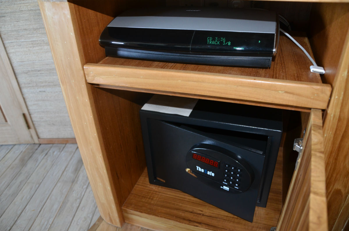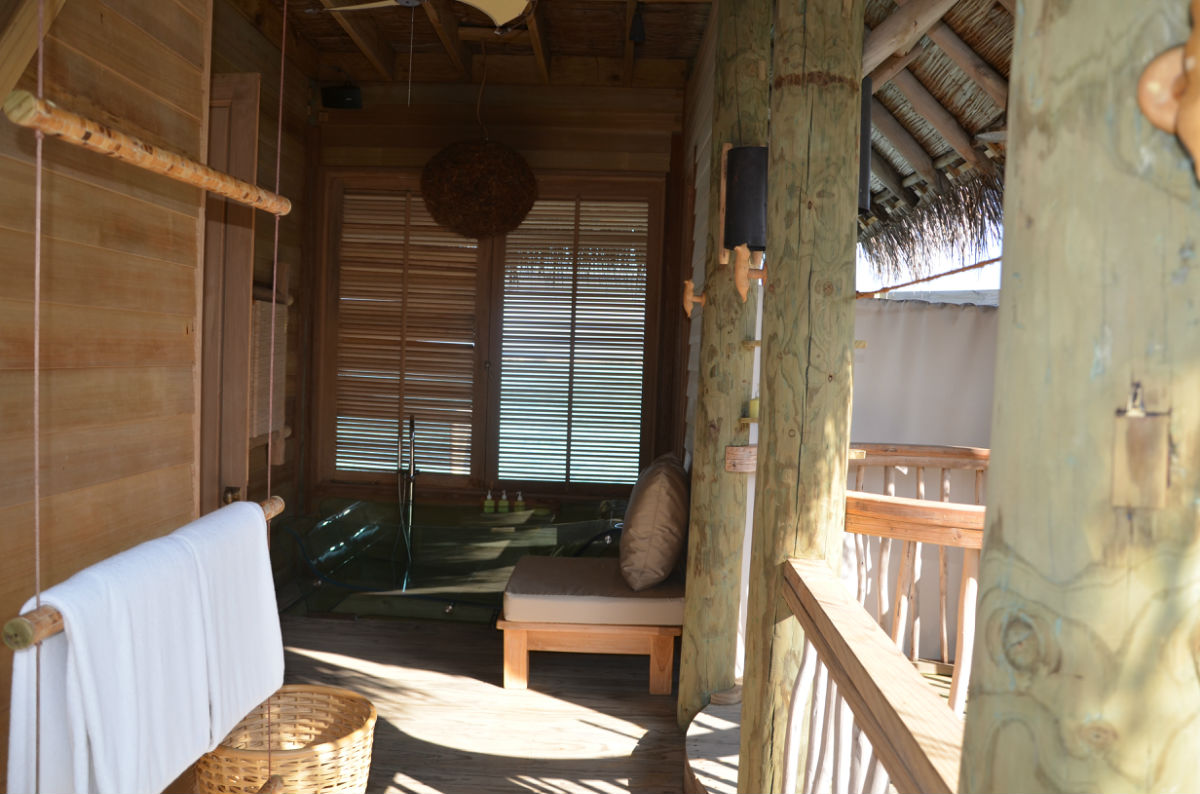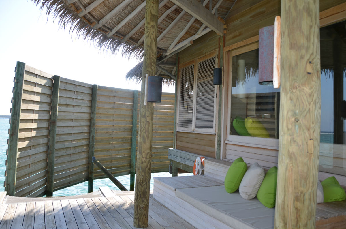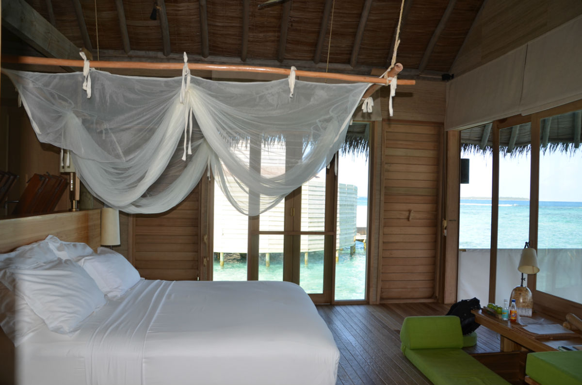快艇还未靠上码头,酒店经理和一行服务人员已经在等候了,上岛后送上两小杯当地的饮料后,经理做了简单的问候,然后有一名服务生成为了“my man”,也就是我们四天在岛上的专职服务员,有任何问题都可以联系他,他会安排我们的一切。他先是给我们做了公共区域的介绍,总台、巧克力屋、冰淇淋屋、酒吧、藏酒窖,然后坐上电瓶车朝我们的居住区驶去,一路上再介绍SPA所在地、瑜伽馆、有机蔬菜园、有机餐厅、露天电影院、水上运动出发点,因为我们住的水屋是靠最里面的一边,一路上就是在热带丛林里穿梭,迷路了伤不起啊。终于到了水屋门口,终于见到了梦幻般的房间。萨达姆(is my man)一一介绍了房间里的各项设施,饮用水每天免费提供四瓶(实际上给了我们五瓶,两瓶大的,两瓶小的,一瓶加气的),送了一瓶香槟。每个房间外都备有两部自行车,出行就靠它们了。这时候给了他5美元小费,随后又给了送行李的小黑2美元。岛上生活正式开始。