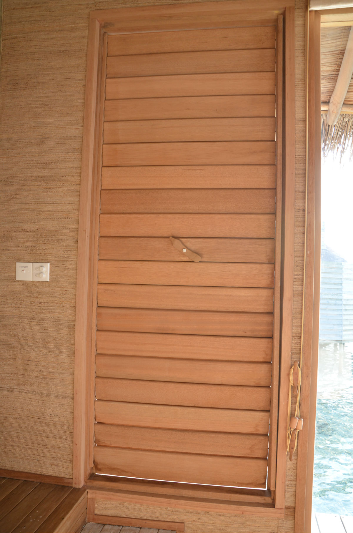 房间里有和洗手间里均有这样的百页式木窗,清晨或傍晚时可以打开透透气,房间里的窗帘拉上拉下的也很方便,拉上去后绳子在旁边一绕即可