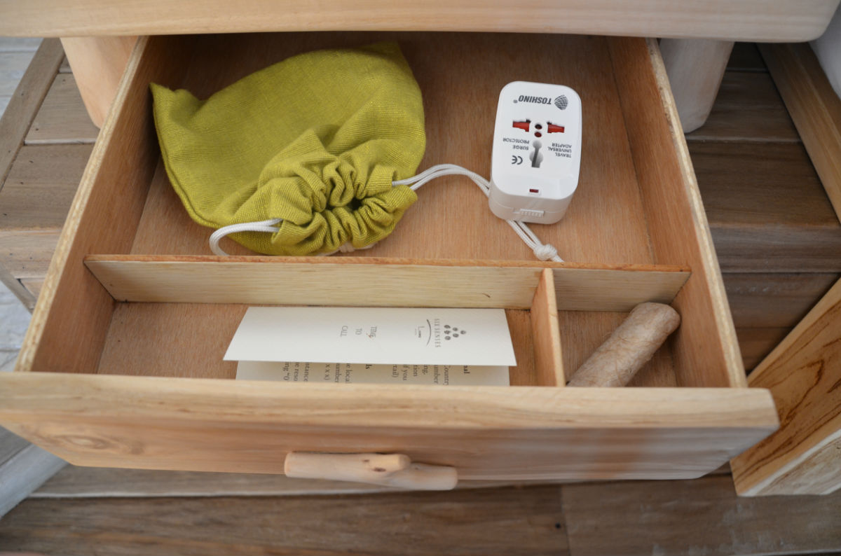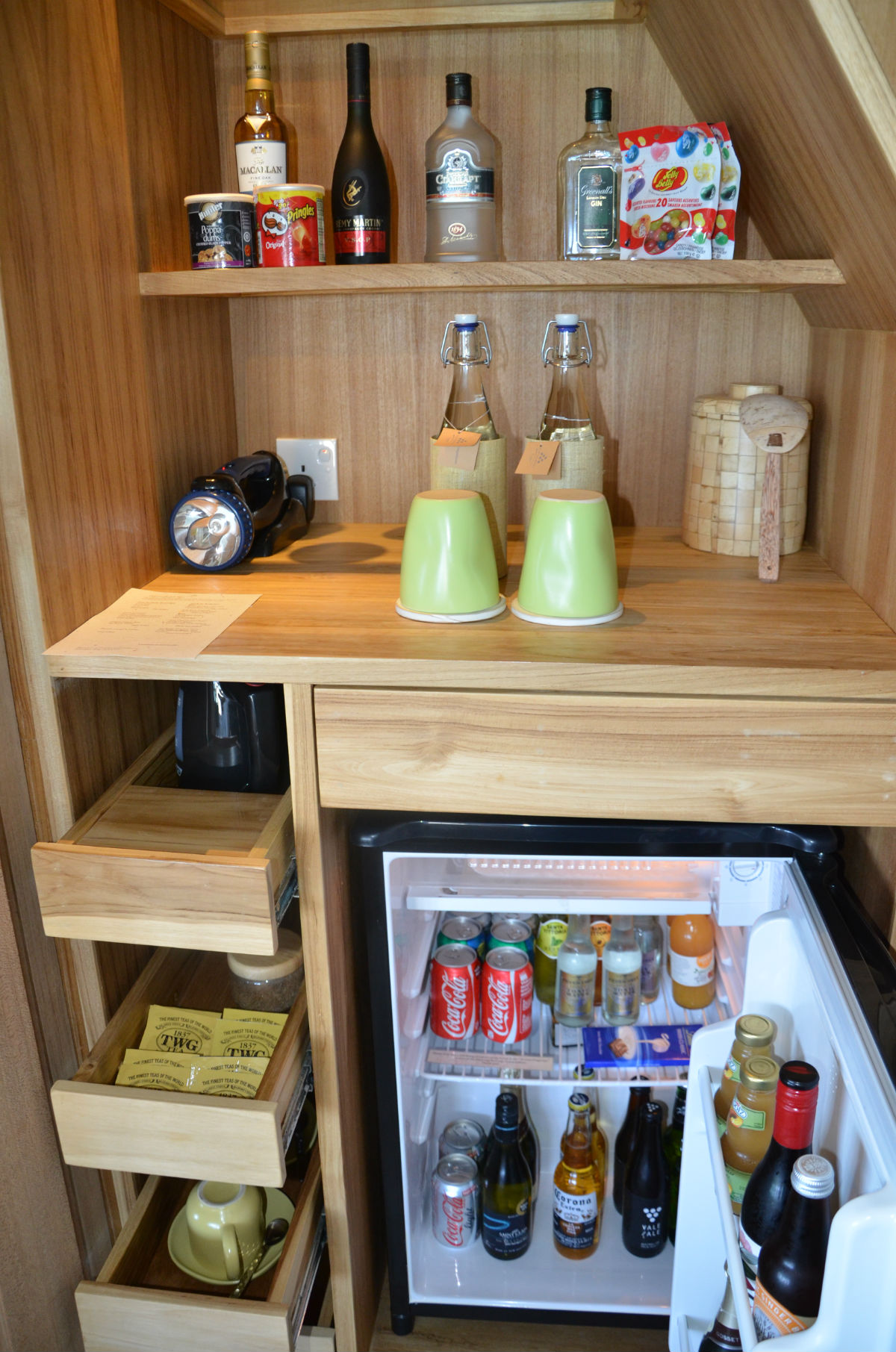 挂有Six Senses Laamu小吊牌的均为免费,咖啡和红茶免费,上面两瓶饮用水每天会更换,冰箱内还有一瓶加气水和一瓶子普通水。应急灯晚上出行的时候带上,充电的时候记得把插座旁边的开关打开,热水壶的电源一直是通的,只需放水加热即可。因为有送香槟,所以记得把冰块制好,等喝香槟的时候放到冰筒里