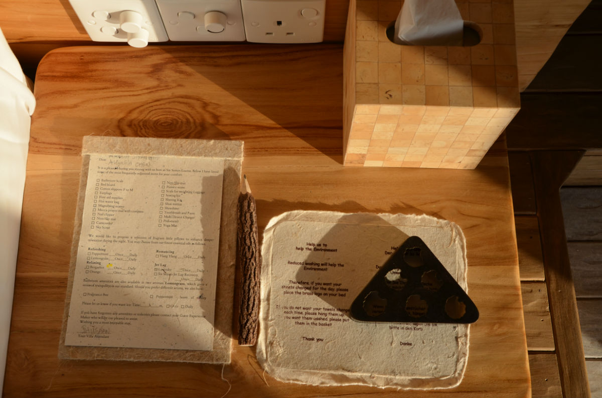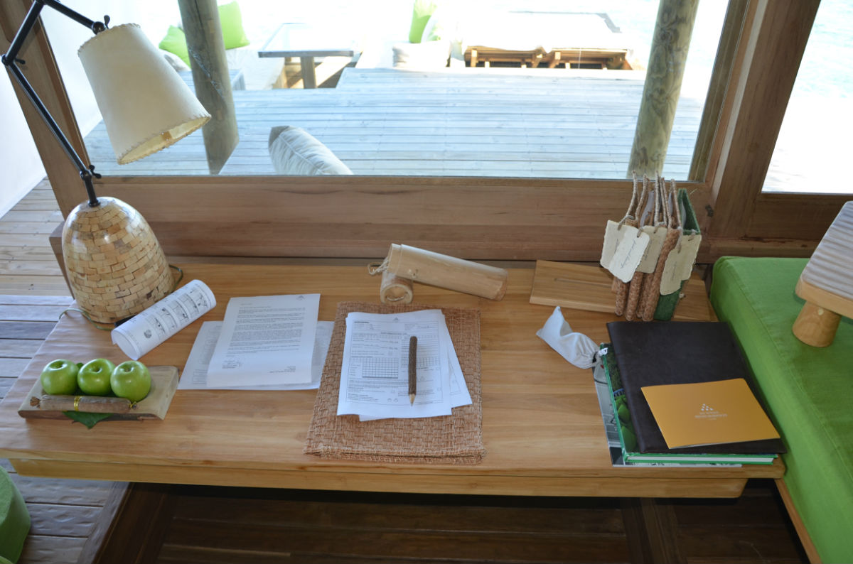 到达后和出发前都会有封信放在桌上或挂在门前,装信的是个木筒,到达之后的是问候信和岛上一些基本信息。出发前的信主要是告之行程,几点来取行李,几点上快艇,几点上内陆飞机,几点上国际航班,还有一些环保慈善项目如果感兴趣的可以参加和捐赠。
