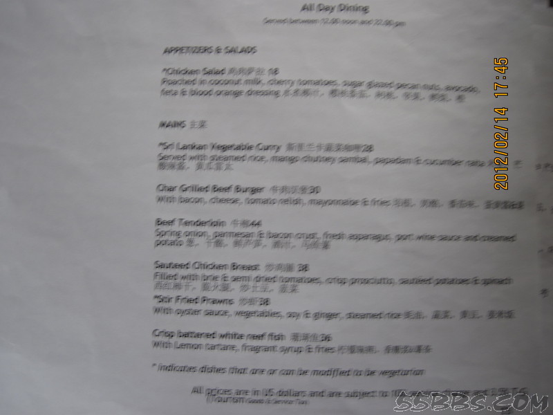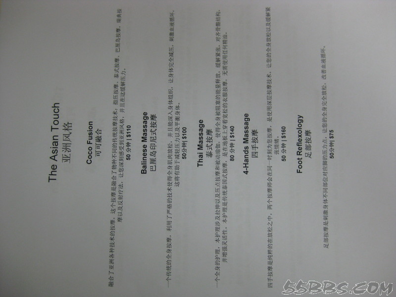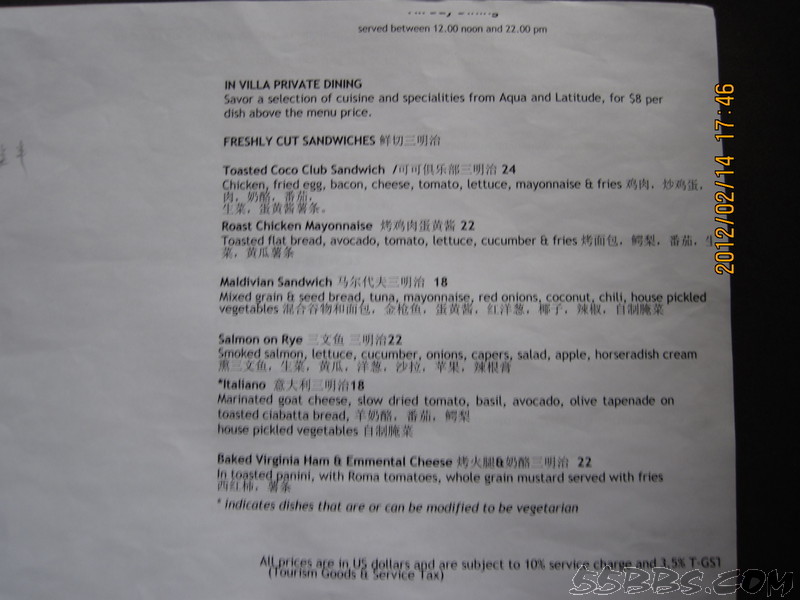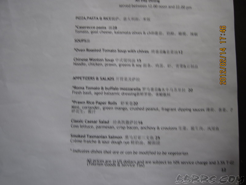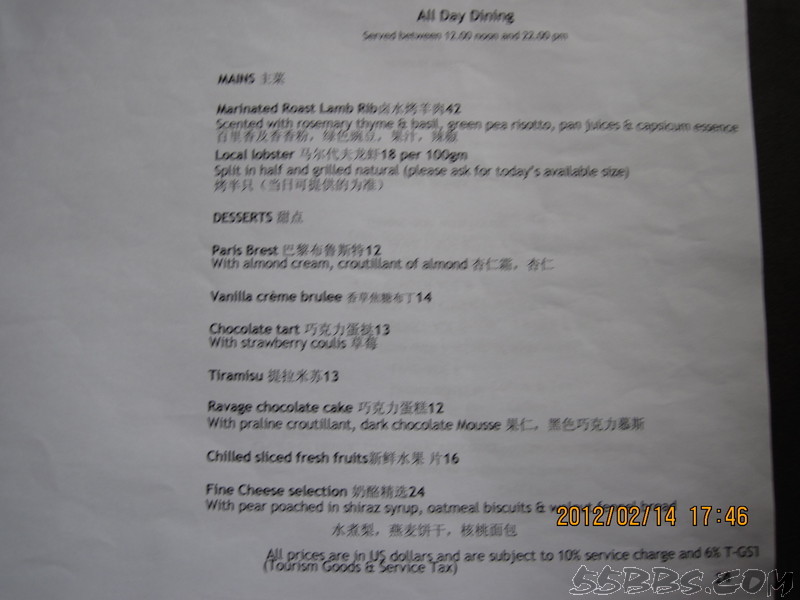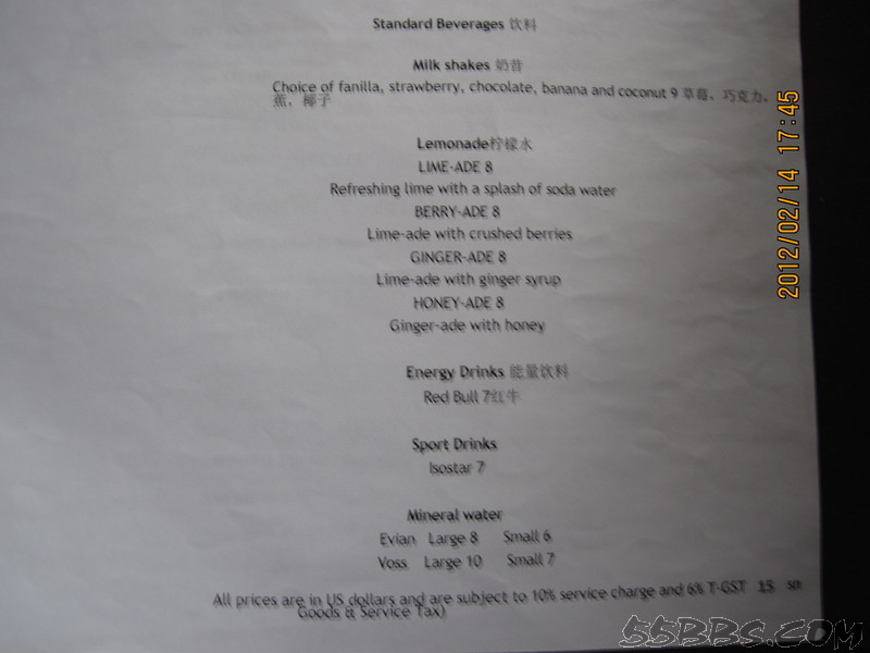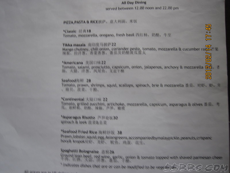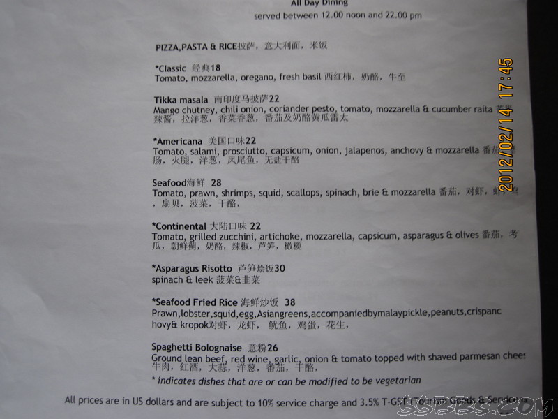 我们定的是含早餐的,我个人认为自助不好吃,所以一定要带一些可口的食品,比如卤蛋,火腿肠,辣椒等,餐厅和酒吧都有中文餐单,我们吃过一次BBQ ,135美金一位,还有150一位的,只是两位送一瓶酒,我们就点了135一位的,可以试一下,但和国内的烧烤就没得比了,有龙虾,不太大,还有羊排,味道还不错,还有牛排,鱿鱼等,前面我也说过了。还在TSUKI日本料理餐厅吃过,三文鱼一般,寿司品种不多,还有金枪鱼,鱼籽,龙虾寿司,等我们吃完了,旁边一对外国夫妻点的龙虾蒸米饭上来了,看得不错,问了小黑,40美金一份,第二天中午想点一份尝尝,居然不营业,只好作罢。在STAR餐厅也点过餐,份量很少,一份龙虾,只有4片,小黑很好,上餐后,用英语告诉我餐名,看我没听懂,就在纸上画了只龙虾给我看。一份牛排,味道不错,就是太小,不够吃。在酒吧点了一个披萨,还可以,其余就是在房间点餐了,海鲜炒饭,汉堡,三明治分量都可以,味道也还吃得惯。