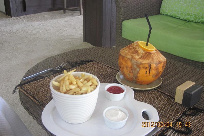 !出了机场就看见有小黑们拿着酒店的牌子借机,很容易就看到了接我们的小黑,他也很机灵,冲他笑了一下,他就朝我们走来了,带我们到柜台上核完就送我们上快艇了。晚上什么也看不到,快艇也很颠,就不停地问小黑还有多久,过了45分钟,总算到了,来接我们的有中文GO,我的那个激动啊,这下在岛上不发愁了。发几张图,是我们的欢迎香槟和点心。
